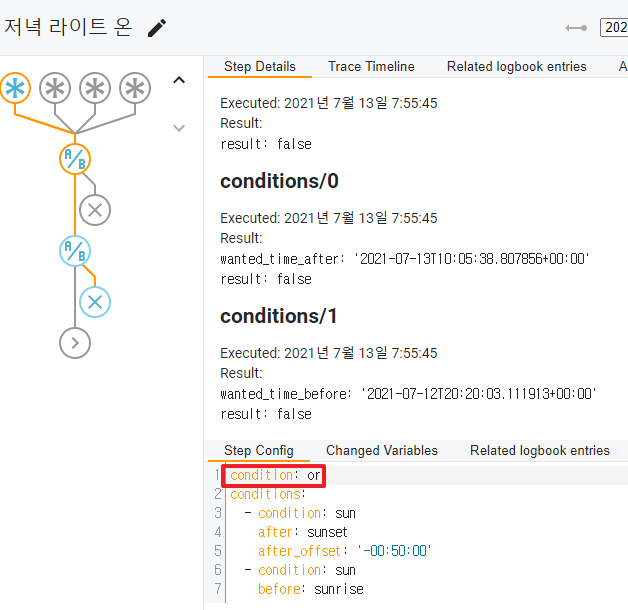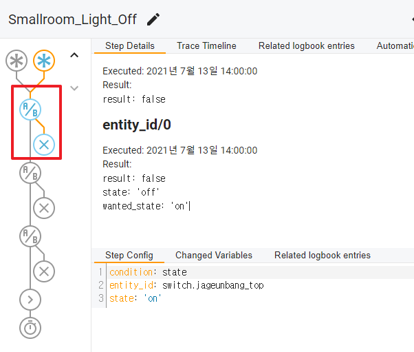 첫번째 트리거를 만족해서 첫번째 컨디션은 통화했는데, 두번째 컨디션 체크에서 실패해서 자동화 동작을 멈췄습니다.