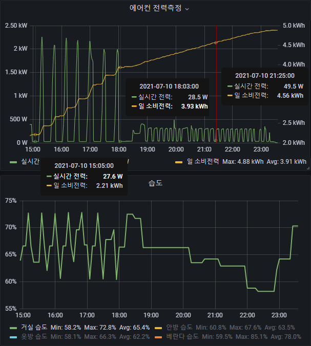 앞의 전력사용량이 삐죽삐죽한 부분은 에어컨의 제습과 냉방의 병행, 뒤쪽은 그냥 냉방 입니다.