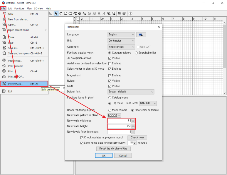다른건 딱히 건드릴게 없고, 아래쪽에 New walls thickness 항목과 New walls height 항목만 보면 됩니다.