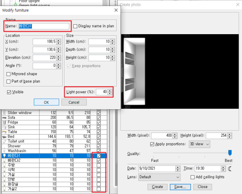 아, Create photo 창이 떠있는 상태에서도 메인창에 있는 항목들을 컨트롤 할 수 있으니 참고하세요!