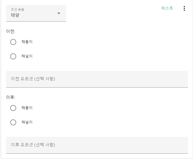 해돋이 이전, 해넘이 이후 = 해가 졌을때 등으로 걸 수 있고, 당연히 오프셋도 설정 가능합니다.