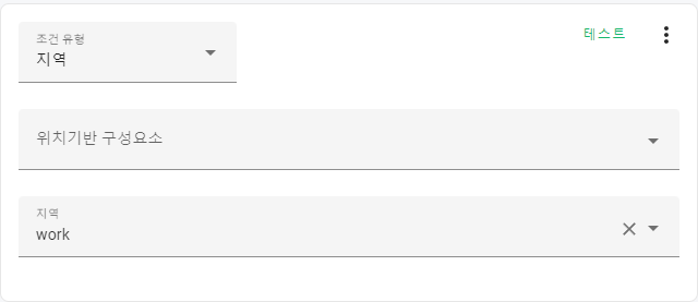 다중조건(not)을 설정하고, 그 아래 지역(zone)으로 device_tracker가 work일때를 설정하면