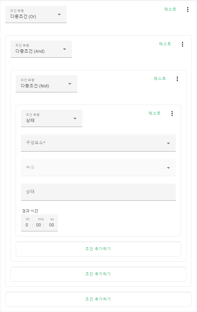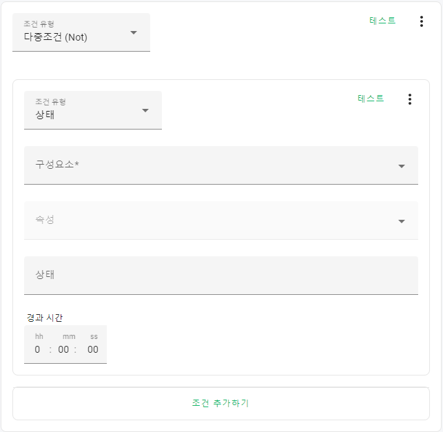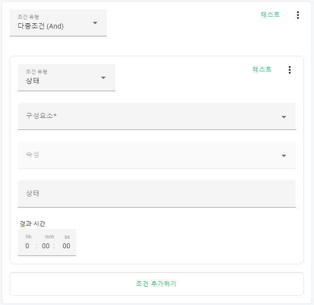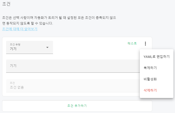 기기, 다중조건(And), 다중조건(Not), 다중조건(Or), 상태, 수치 상태, 시간, 지역, 태양, 템플릿, 트리거