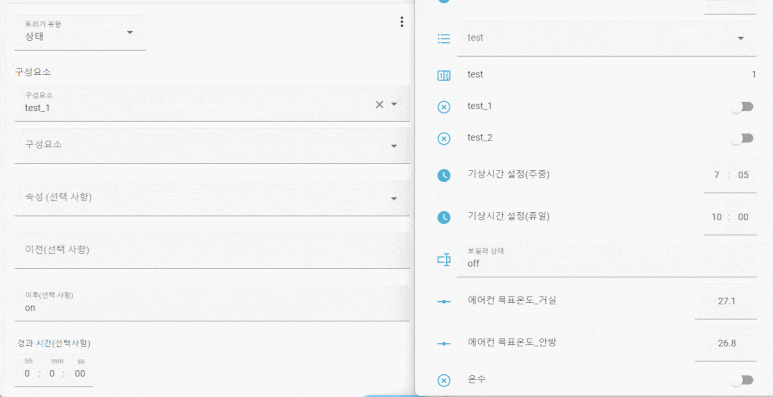 트리거 지점을 input_boolean.test_1 의 on 상태일때를 기준으로 잡으면,