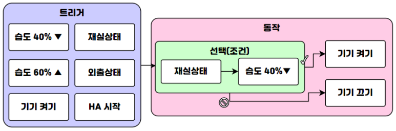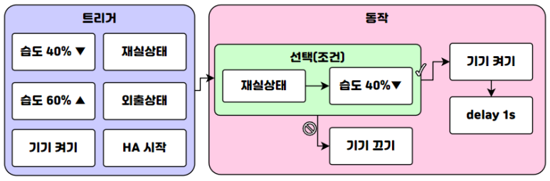 만약 재실 + 습도 40~60%에 트리거 되었을때, 현재 습도가 40% 이상이니 끄는게 맞다 = 현 상태 유지