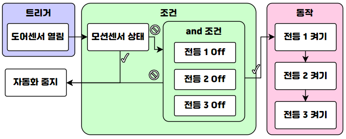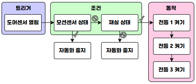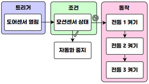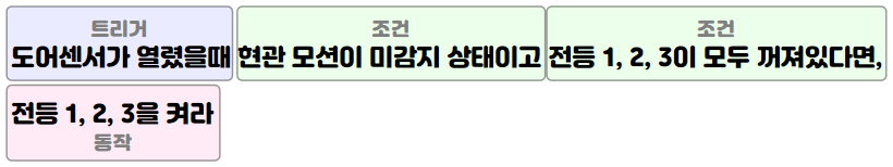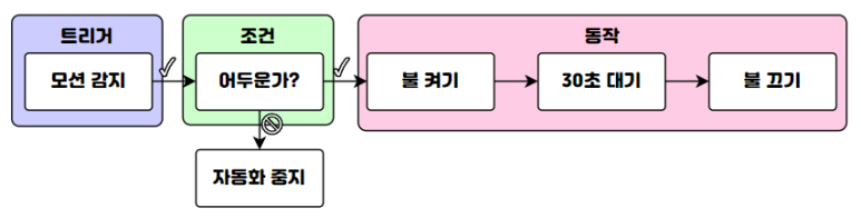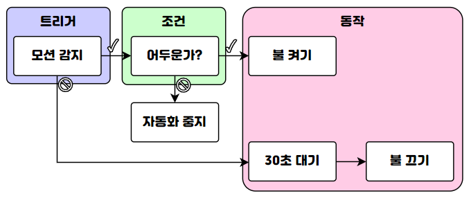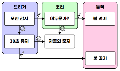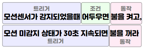 모션이 감지되면 -> 어두운지 확인 후 -> 불을 켜라 -> 30초 대기 후 -> 불을 꺼라