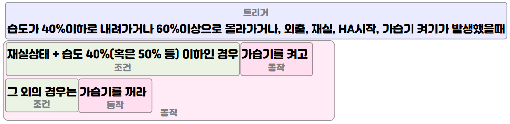 이걸 정리하면, 습도 40% 이하 + 재실상태 일때만 가습기 켜기, 나머지 3개 트리거는 가습기 끄기로 하면 됩니다.