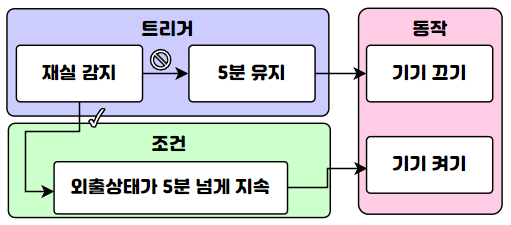그러면 외출 5분후 기기가 꺼지고, 재실 즉시 기기가 켜지겠죠.