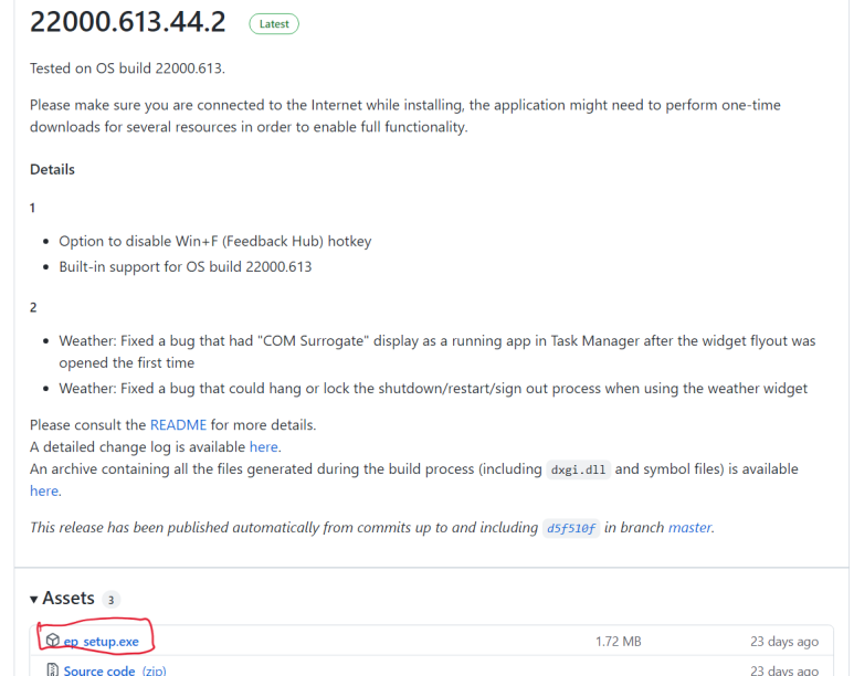 깃헙 사이트 접속 후 우측의 릴리즈 들어가서 Latest 버전의 아래쪽 Assets 에서 ep_setup.exe 를 받아주세요.