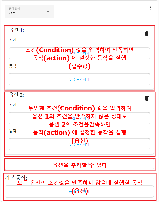 기본적으로 옵션 1 항목(조건/동작) 과 기본동작 으로 나눠지며