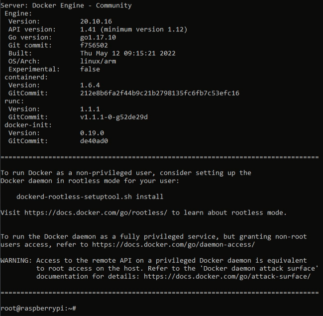 도커 설치가 완료되면, 위 화면처럼 설치된 도커의 버전이 표시됩니다.