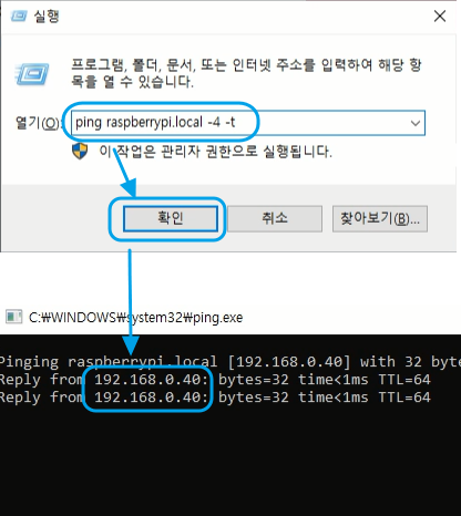 윈도우키 + R(실행 창 호출) -> ping raspberrypi.local -4 -t 입력 후 -> 확인
