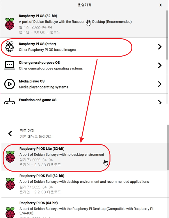 Raspberry PI OS(other) 을 선택해서 Raspberry PI OS Lite (32-bit) 를 선택합니다.