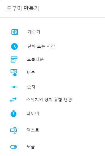 계수기 / 날짜 또는 시간 / 드롭다운 / 버튼 / 숫자 / 스위치의 장치 유형 변경 / 타이머 / 텍스트 /토글