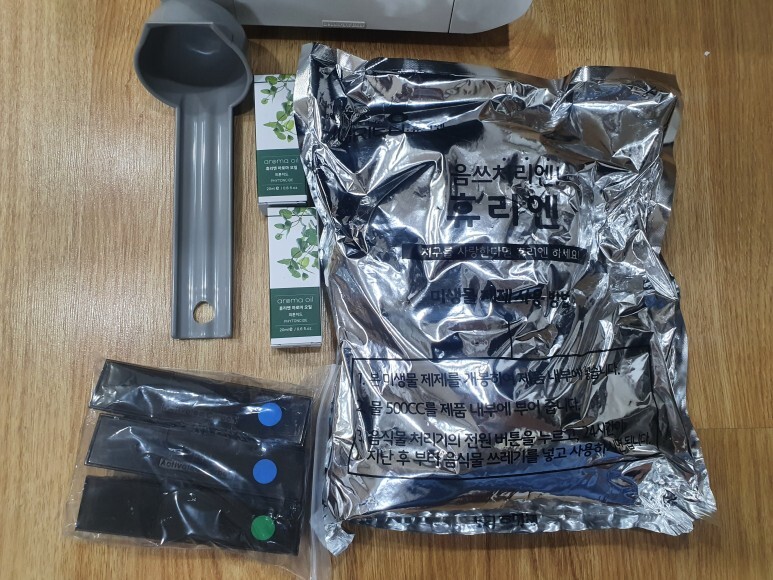 속뚜껑을 열면, 삽과 미생물제제, 여분 교체용 필터 및 아로마 오일이 들어있네요.