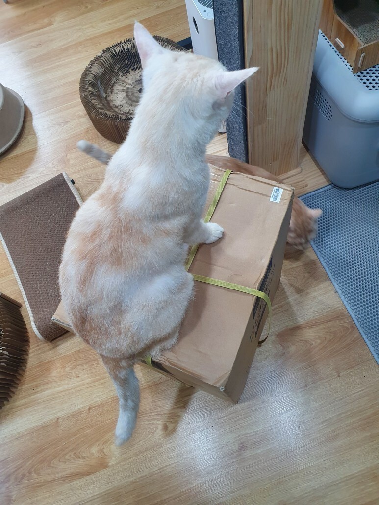 포장은 이렇게 끈으로 둘러져 있습니다.(크림이가 검사중 입니다...)