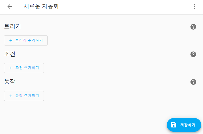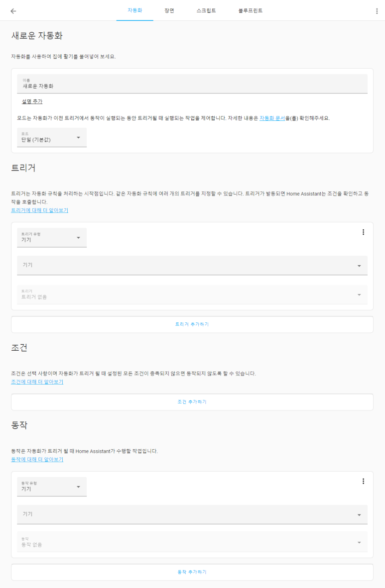 HA의 자동화 구성화면은, 언제나 트리거/조건/동작 부분이 활성화 되어 있습니다.