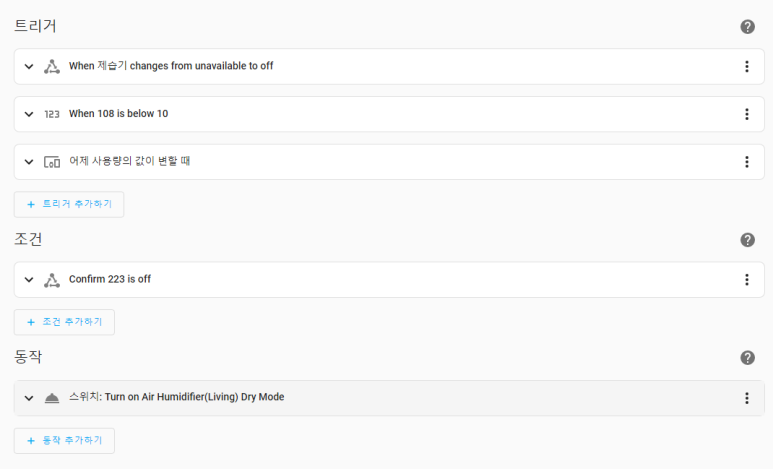 트리거나 조건, 동작을 여러개 추가하면, 이런식으로 접어둘 수 있구요(간략한 정보는 표시되니 보기 편하죠?)