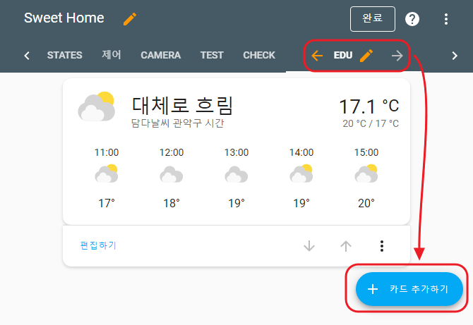 카드를 추가할 뷰를 선택 후, 우측 하단의 카드 추가하기를 눌러주세요.
