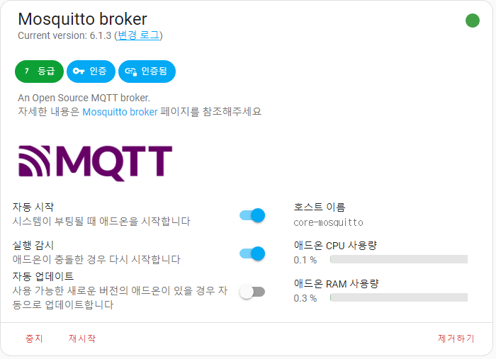 마지막 과정으로 통합구성요소에 Mosquitto Broker(MQTT) 를 설치합니다.