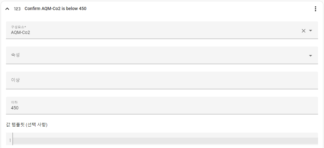 첫번재 조건은 AQM-Co2라는 센서의 수치가 450 이하일때 로 지정했습니다.