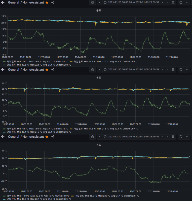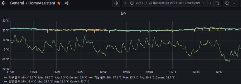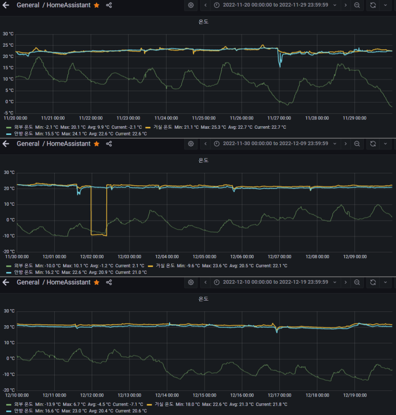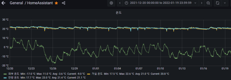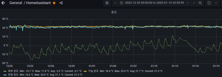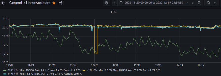 중간에 거실온도가 바닥을 쳤는데, 이때 espeasy 센서쪽 문제로 인해 일부 데이터가 누락되었습니다.