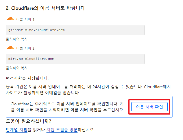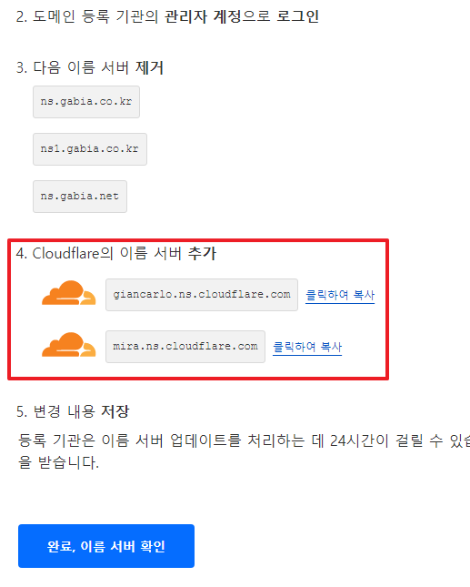 도메인 관리기관에 네임서버 변경을 해주라는 안내가 뜹니다.