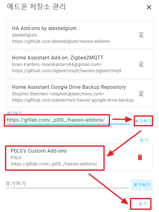 HA의 설정 - 애드온 - 애드온 스토어 - 우측상단 3점 - 저장소 로 이동합니다.
