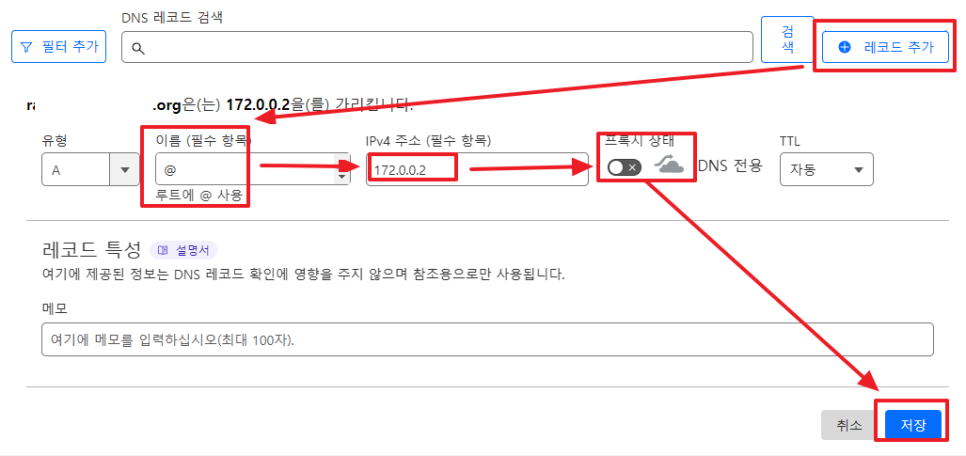 레코드 추가 -> 유형은 A -> 이름은 @ -> IPv4 주소에다가 172.0.0.2 입력(어차피 바꿀거라 대충 입력) -> 프록시 상태 끄고 -> 저장