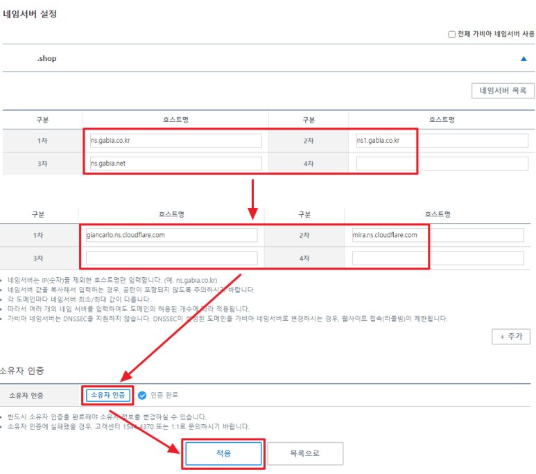 기존에 써있던 1차, 2차, 3차를 지우고 클라우드플레어 에서 제공하는 네임서버로 변경해 줍니다.