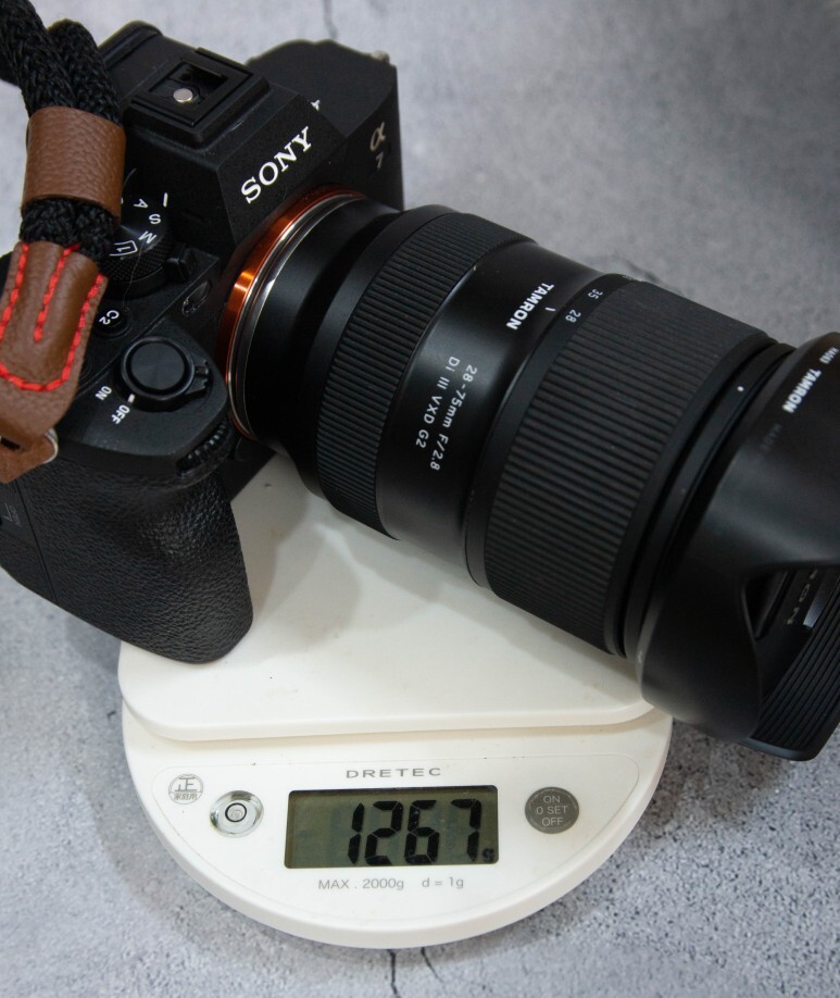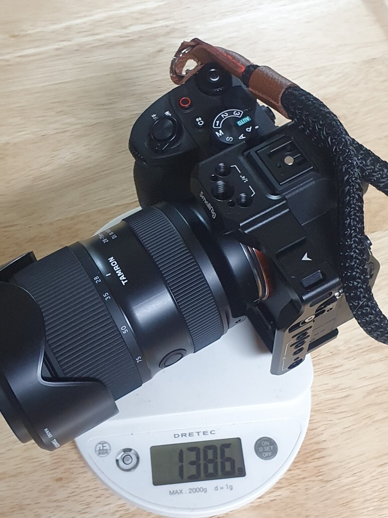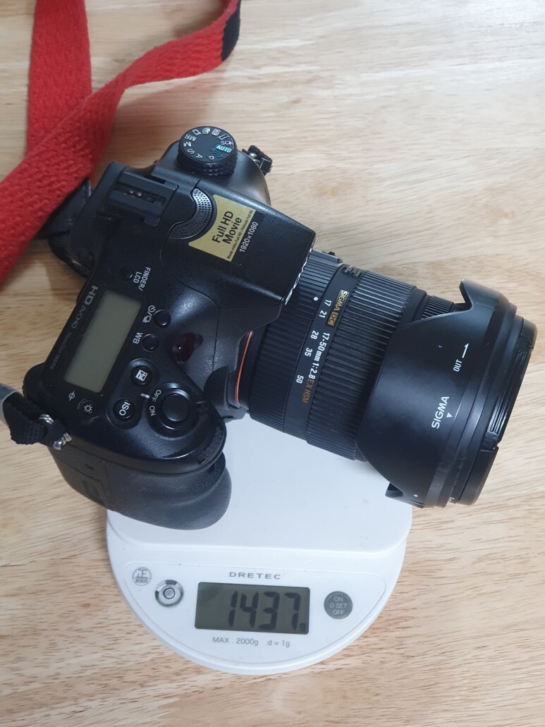 원래 쓰던 구성인 a77(스트랩 일부 무게, 도브테일 플레이트) + 시그마 DC 17-50 F2.8 (후드, 캡 포함)