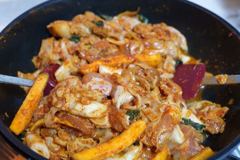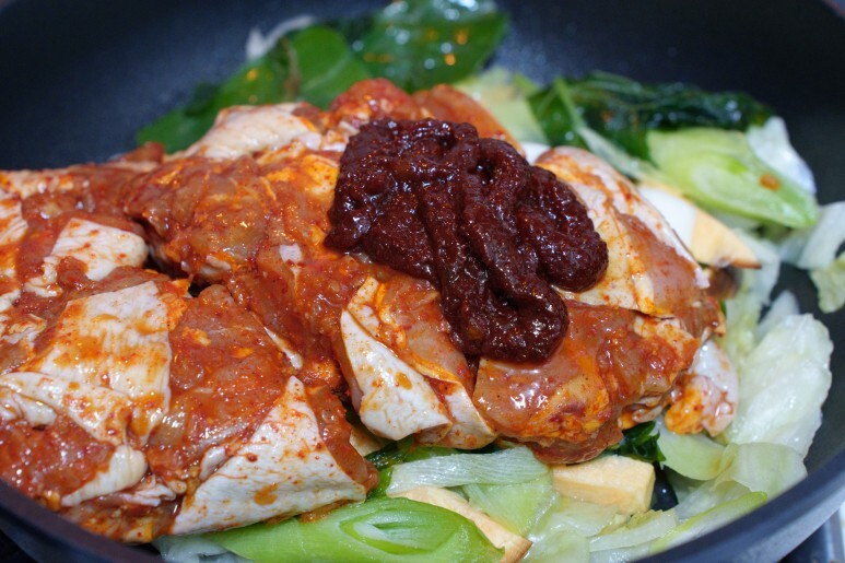 그리고 닭갈비를 까서 올려주고, 그 위에 양념장 추가!