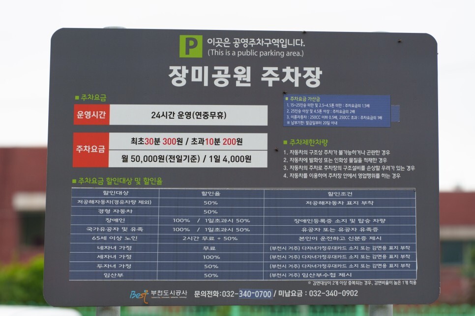 지도상 장미원에 붙어있는 주차장(무료) / 그리고 그 길건너에 있는 장미공원 공영 주차장(유료, 5월 무료개방)