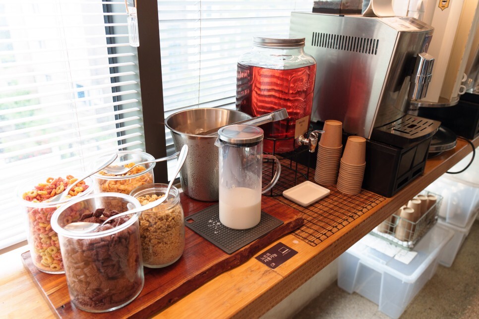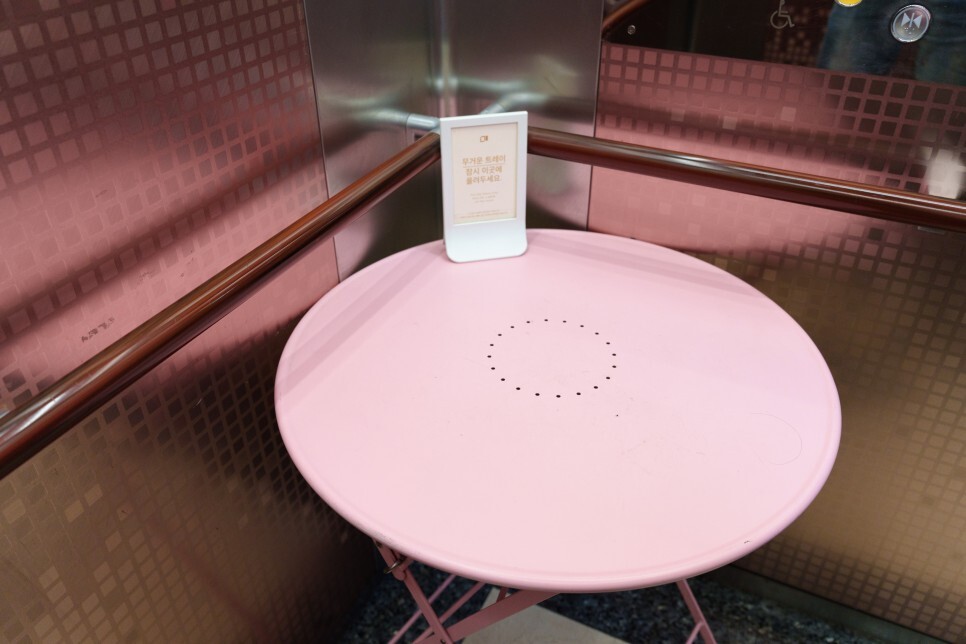 엘베 입구와 안쪽엔 이렇게 트레이 놓을 테이블이 있어요.