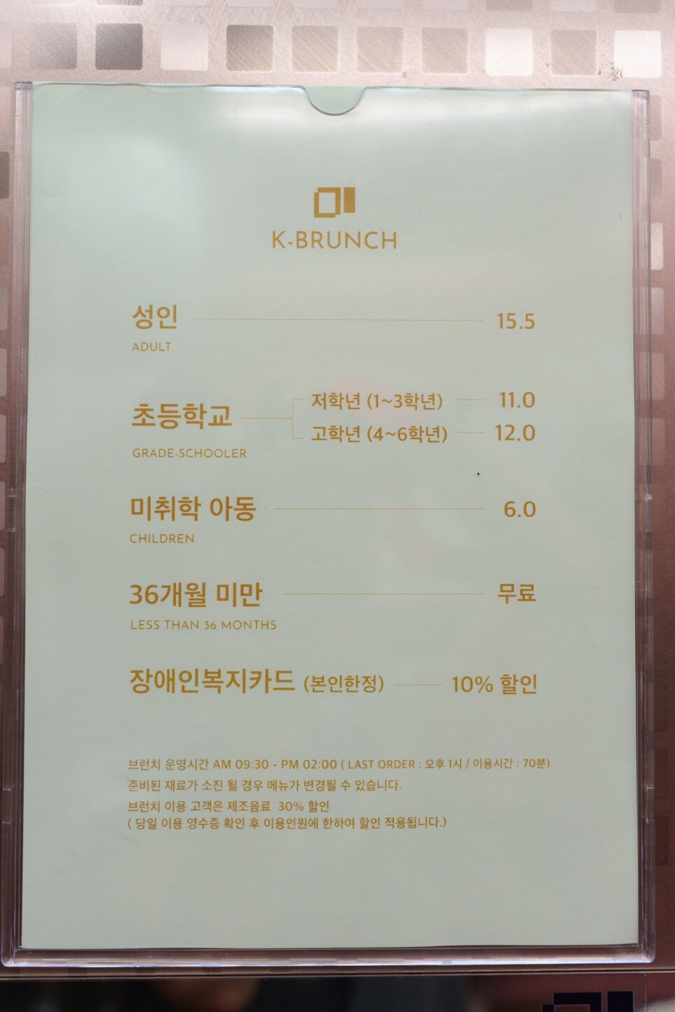 브런치 메뉴와 가격.