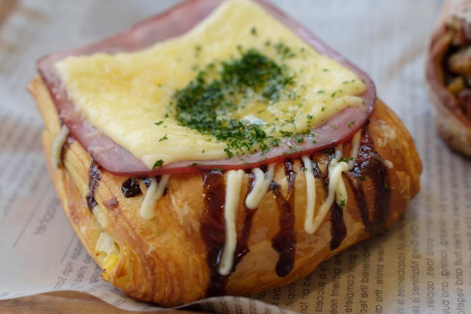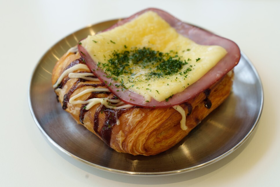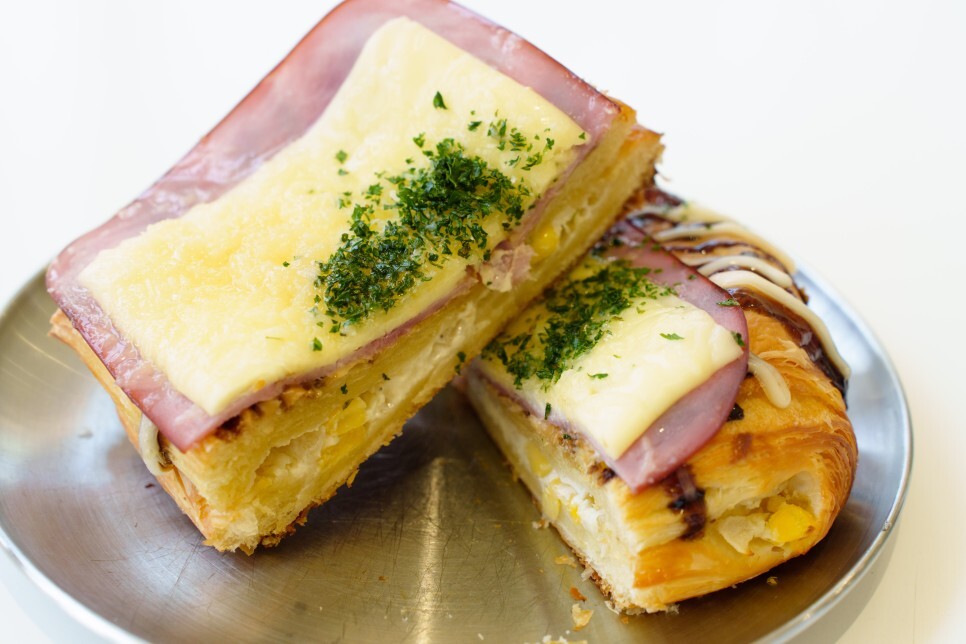 어니언과 콘이 들어있는 페스츄리 빵 위에 햄과 치즈가 올라가 있어요.