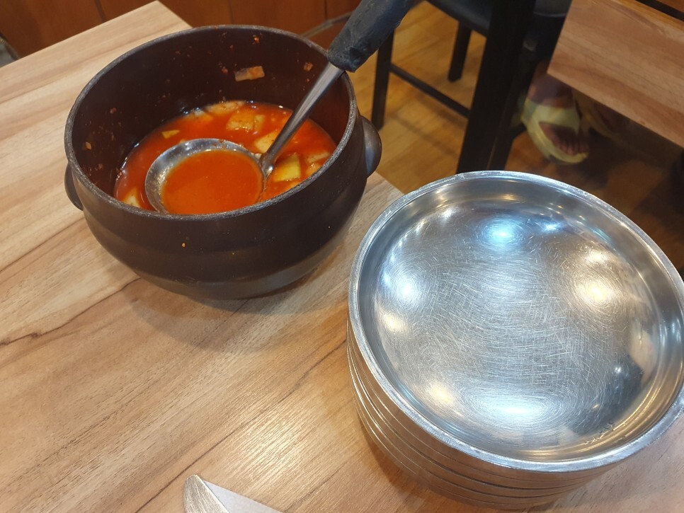 테이블에 깍두기와 앞접시가 놓여져 있는데, 사장님이 깍두기 맛있다고 자랑을 하셨...