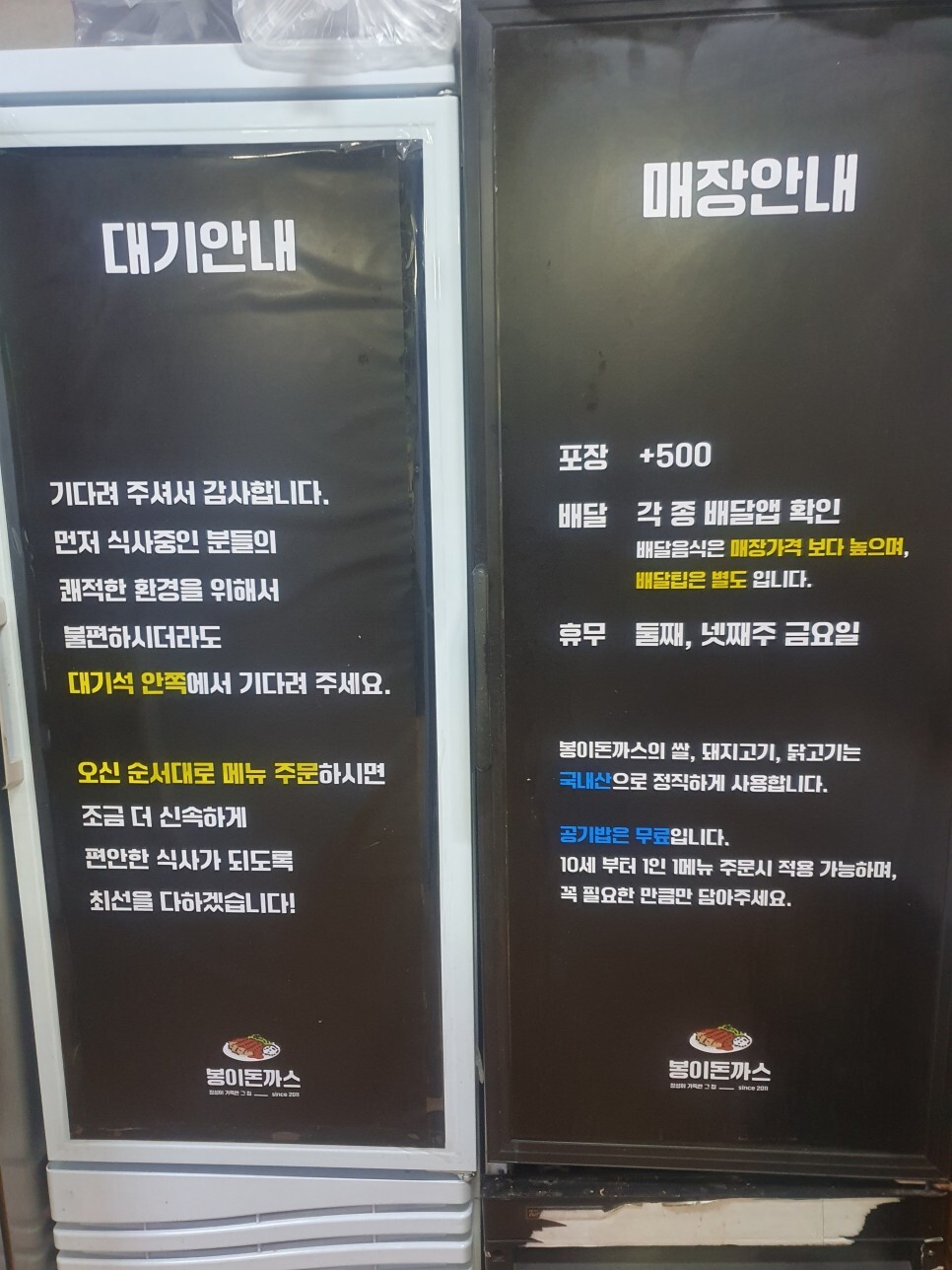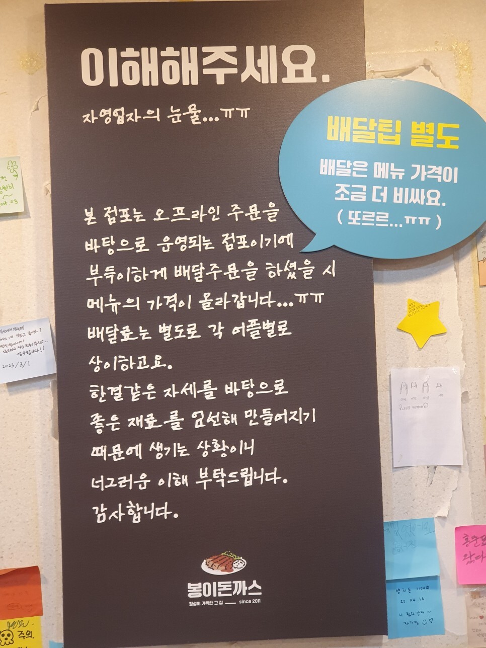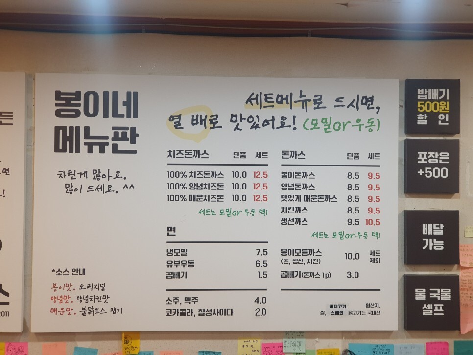 메뉴는 기본적으로 돈까스 소스 3종 봉이돈까스(기본 돈까스) / 양념돈까스(양념치킨의 그 양념) / 매운돈까스(이건 많이 맵다고..) 3가지 이고