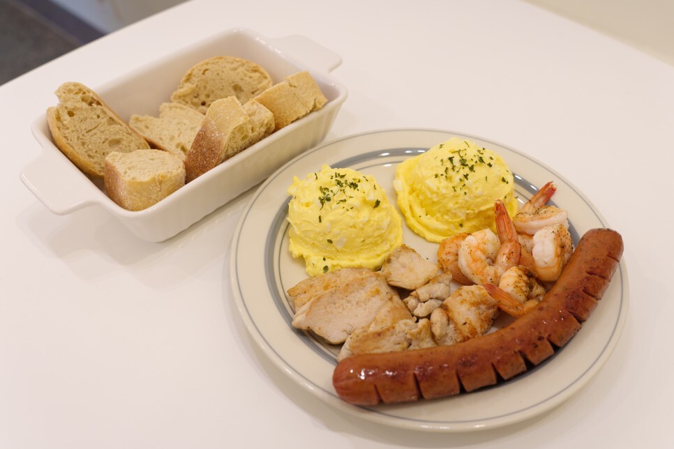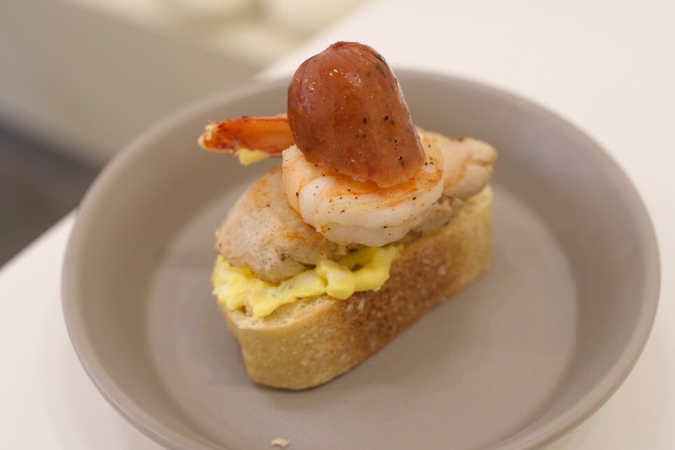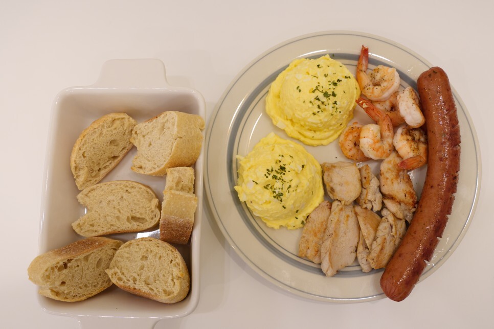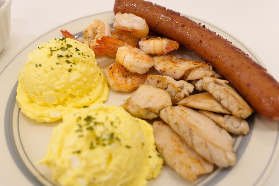 치아바타 빵을 베이스로 에그샐러드, 닭가슴살, 소세지, 새우를 마음껏 올려 먹을 수 있어요.
