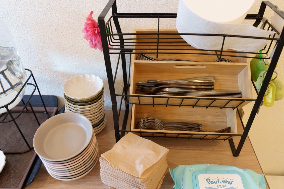 물과 앞접시, 식기는 여기서 챙겨갈 수 있습니다.