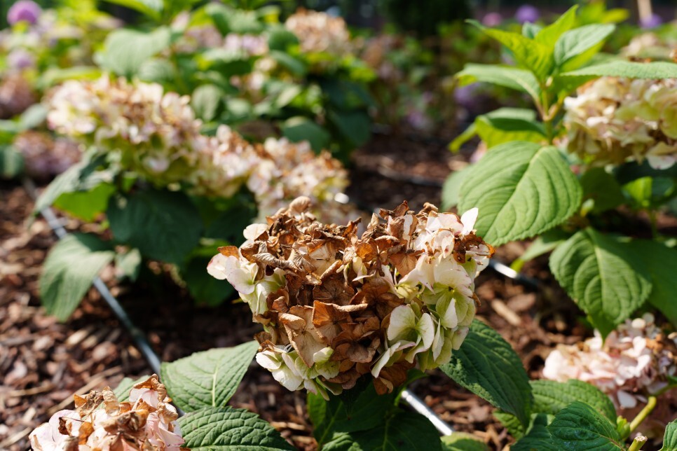 피고있는 / 말라죽은 / 잘 피어있는 수국이 공존하고 있습니다.