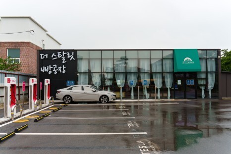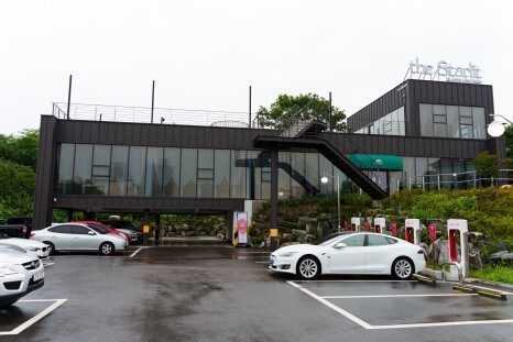 주차장엔 테슬라 슈퍼차져가 있습니다.