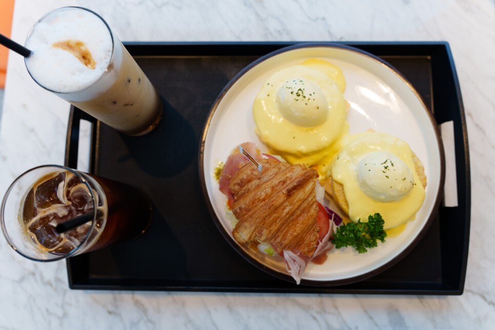 아이스아메리카노 / 캬라멜마키아또 / 에그베네딕트&하몽센드위치 입니다.