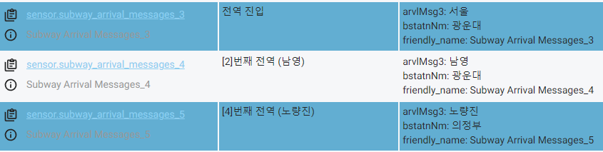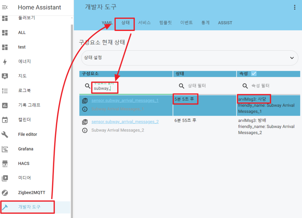 반대로 하셨다면 센서 상태 값에 역 / 속성의 arvlMgs2에 남은 시간이 표현될 겁니다.