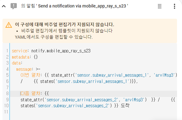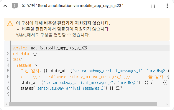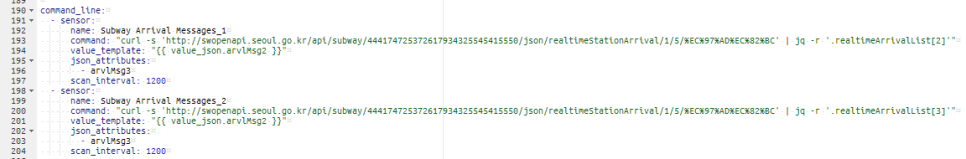 센서의 값인 value 부분은 value_template: 으로 설정해서 "{{ value_json.arvlMsg2 }}"