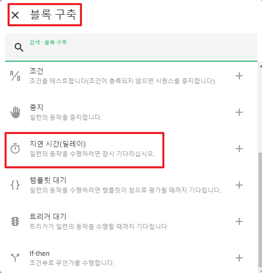 이건 선택사항이긴 한데, 블록 구축에서 지연시간(딜레이) 를 1초 정도 넣어주세요.
