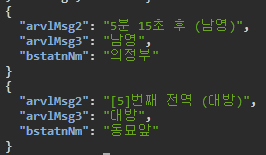 (물론 여기서 arvlMsg2(남은시간) / arvlMsg3(현재역) 은 변경해도 됩니다. 센서에 어떻게 표시되는지 차이니까요)