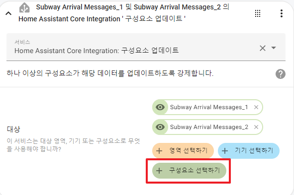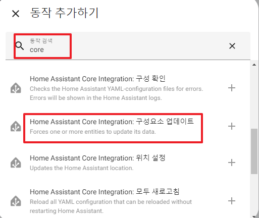 동작 추가하기에서 core로 검색해서 내리면, Home Assistant Core Intergration: 구성요소 업데이트 가 보입니다.