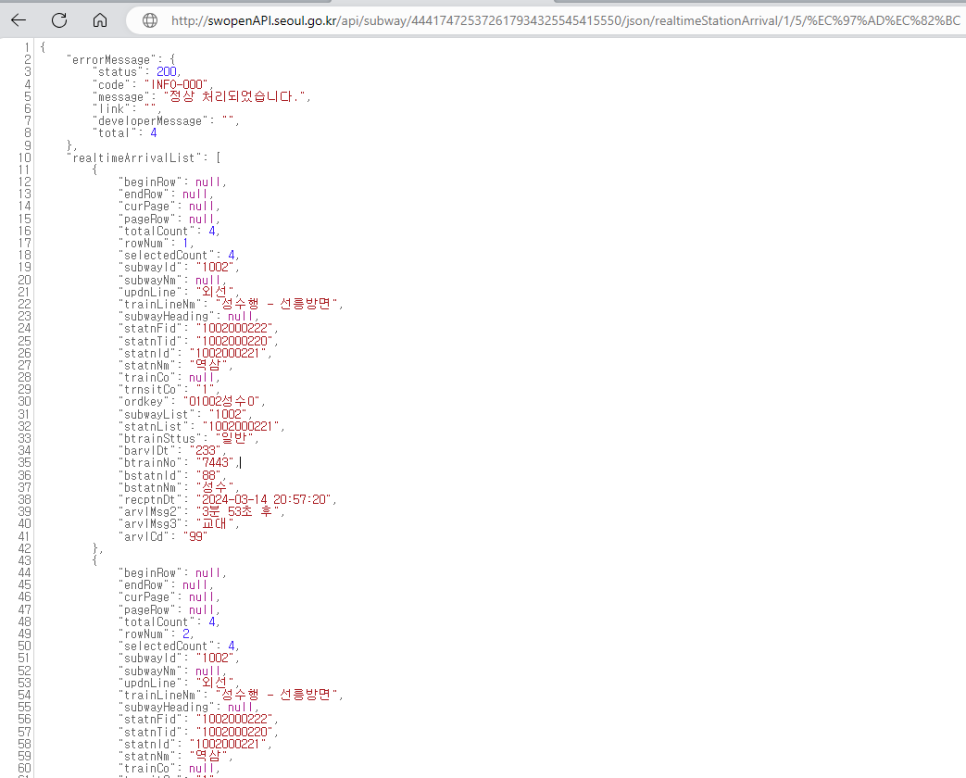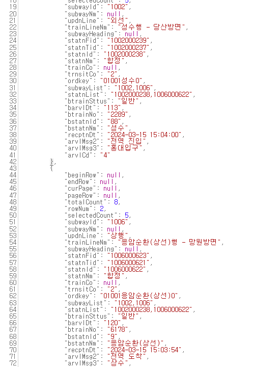 이런식으로 나오는데, 여기서 우리에게 필요한건 subwayId 항목과 ordkey 부분 입니다.