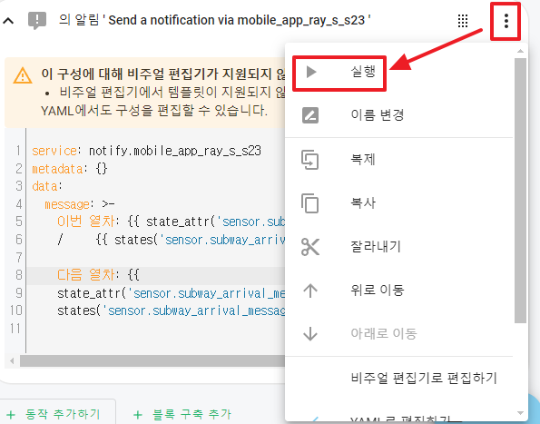 그런 다음 동작의 우측 상단 3점을 눌러 실행을 해봅니다.